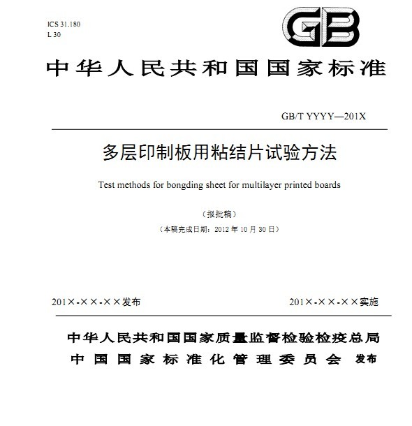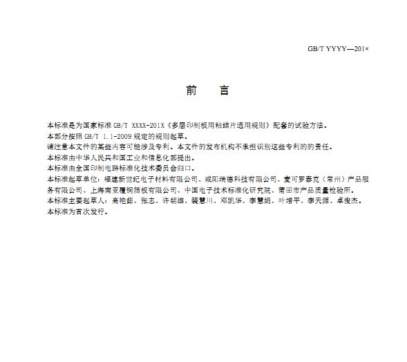 國(guó)家標(biāo)準(zhǔn)GB/T YYYY-201X《多層印制板用粘結(jié)片試驗(yàn)方法》由咸陽(yáng)瑞德科技有限公司與福建新世紀(jì)電子材料有限公司廣東生益科技有限公司、上海南亞覆銅箔板有限公司、莆田市產(chǎn)品質(zhì)量檢驗(yàn)所、中國(guó)電子技術(shù)標(biāo)準(zhǔn)化研究院共同負(fù)責(zé)起草。