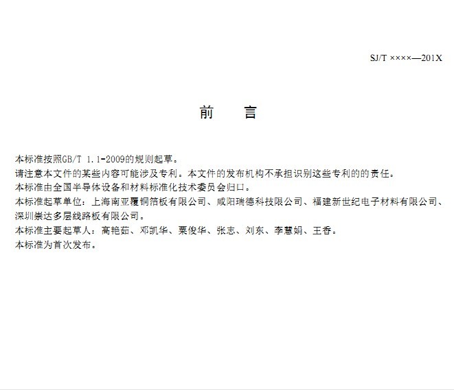 電子行業(yè)標(biāo)準(zhǔn)SJ/T XXXX-201X《多層印制板用氰酸酯改性環(huán)氧玻纖布粘結(jié)片預(yù)浸料》由咸陽瑞德科技有限公司與上海南亞覆銅箔板有限公司、福建新世紀(jì)電子材料有限公司、深圳崇達(dá)多層線路板有限公司負(fù)責(zé)起草。